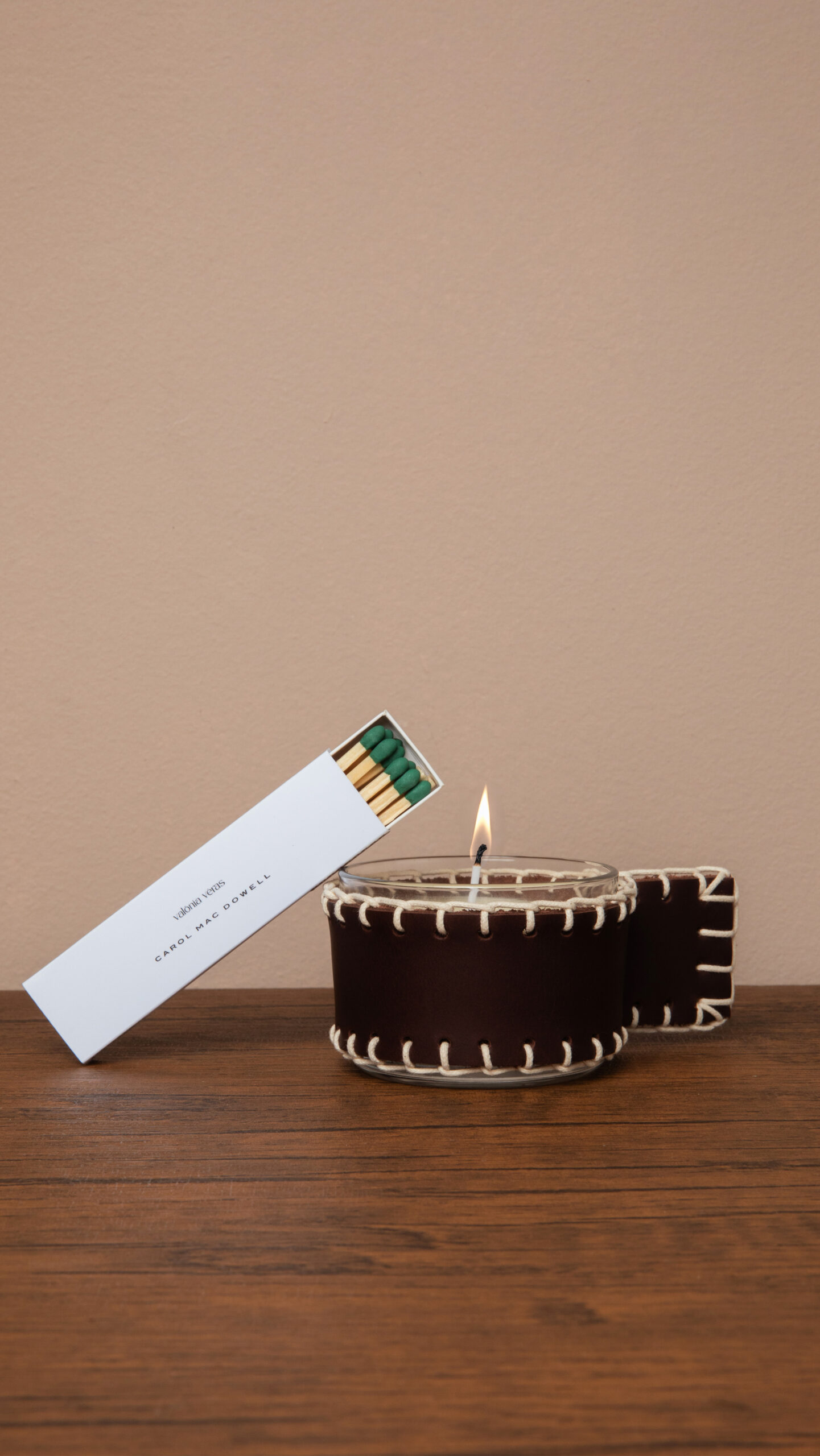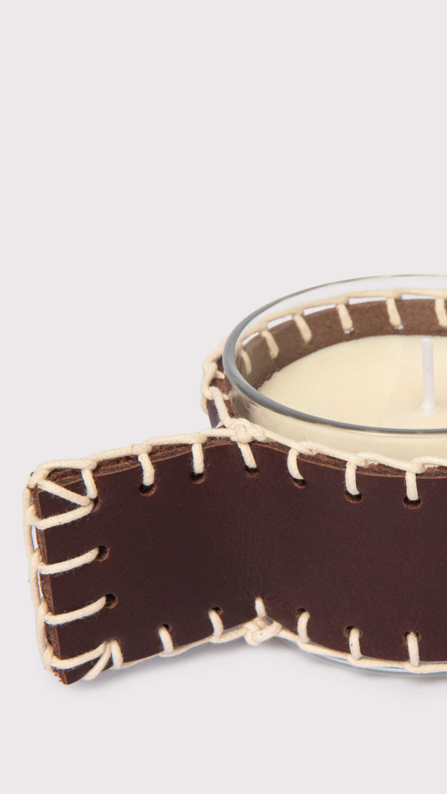 Vela com aroma inspirado na primavera, de notas cítricas e florais. Em pote de vidro com suporte em couro natural (soleta) e acabamento em costura manual.
